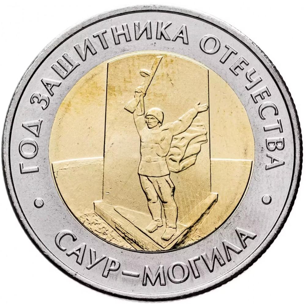 Оформить заказВторая монета номиналом 50 рублей в истории современной России. Она посвящена освобождению Донбасса советскими воинами в 1943 году. На реверсе монеты расположено рельефное изображение рельефное изображение фрагмента мемориального комплекса «Саур-Могила»; на кольце по окружности – рельефные надписи, разделенные точками: в верхней части – «ГОД ЗАЩИТНИКА ОТЕЧЕСТВА», в нижней части – «САУР-МОГИЛА».